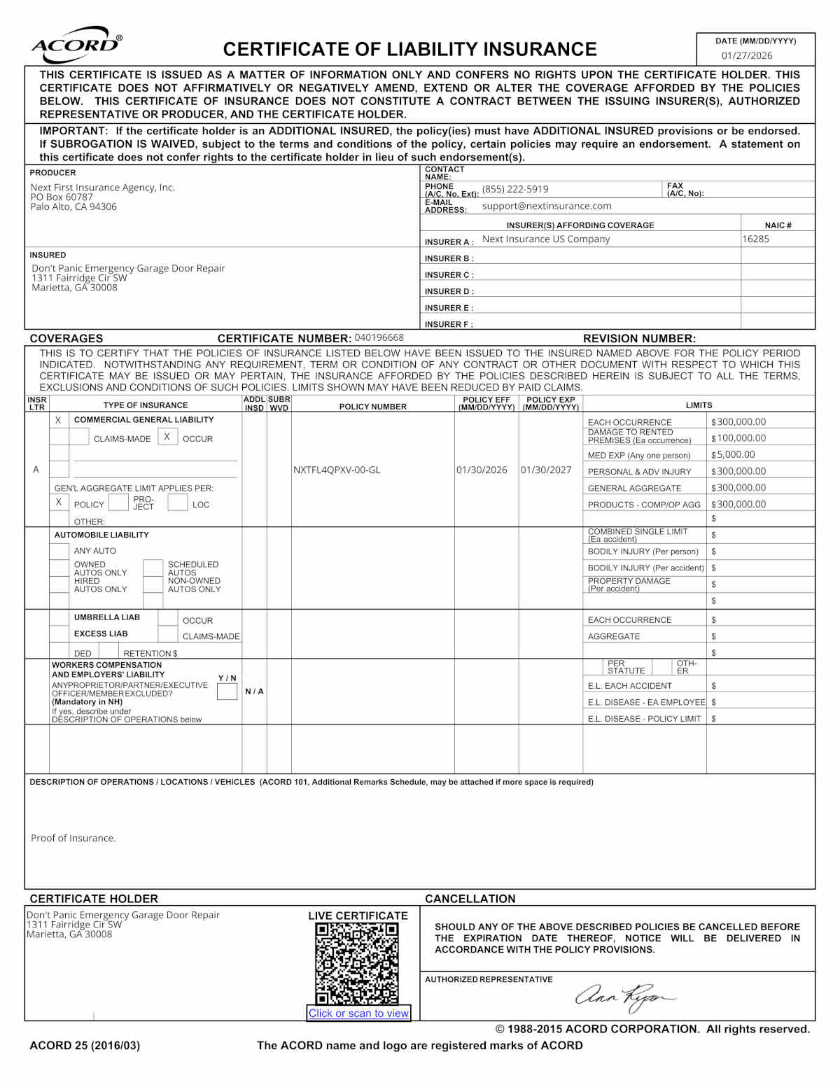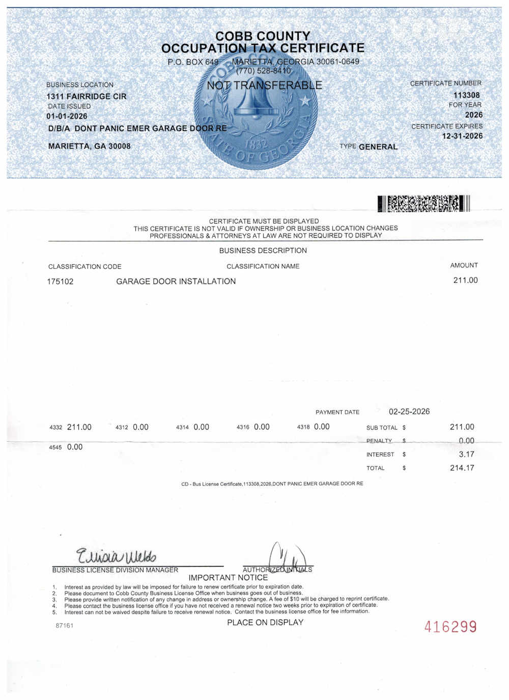 So you’re having some trouble with your garage door or opener. Let me introduce myself. My name is Phil Spencer, owner of Don’t Panic Emergency Garage Door Repair. If you live in Cobb county GA or any of the counties bordering Cobb (Douglas, Paulding or Cherokee) I would like you to consider me and my little business for solutions to your residential garage door or garage door opener needs. I started this business 19 years ago and I can proudly say that I have installed hundreds of openers, replaced hundreds of broken springs, righted many garage doors off track and installed a few new garage doors along the way. My phone number is 678-607-6046. I am licensed and insured. I strive to provide my customers with excellent quality materials and workmanship. I always treat my customers and their property with the utmost respect.